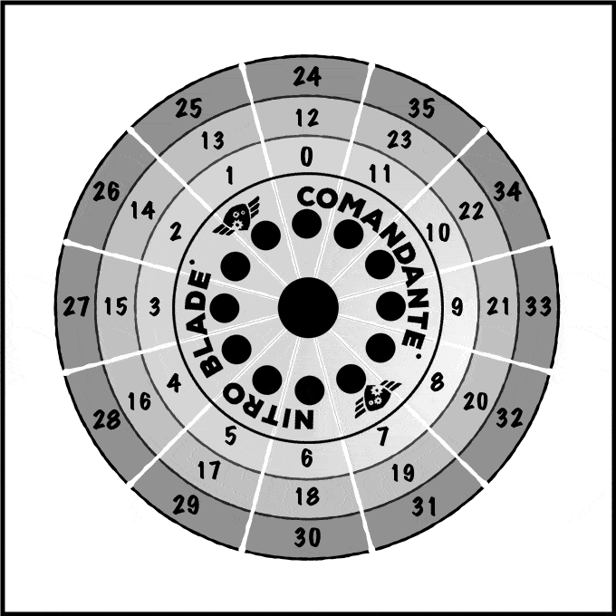 Comandante'nin öğütücü (burr) kısmı maalesef standart değil. 12 ayar noktası ile, hiza için kullandığımız "Comandante Nitro Blade" yazısı değirmenden değirmene farklılık gösteriyor. Bu yüzden şablonda istediğimiz referans noktaları her bir değirmen için farklılık gösteriyor.